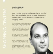 I AM A BrIdgeBy David W. BermantI am a Bridge, a connection between the art form that has been described to you on the panel this morning, and the public spaces of America, in particular my shopping centers.About twenty years ago, I began placing this form of art in my centers. The art that I promoted or advocated the use of in public spaces is different because it’s not artthat just has a technological connection. It’s art that comes out of the technology and/or science of ourtime. It can consist of the materials or the stuff of everyday living—the products of a technological society.It’s been my observation, and that of others, that the art works that have been placed in public areas up until now have been largely rejected by the very public that they were intended to attract.There are special public moods to the art becauseof the audience that the art appeals to. It needs explanation. In a shopping center or in a public square, or in a corporate building, labels are vital. Labeling helps the non-art lover, who is 99 percent ofthe public, to understand what the art is about, what it’s trying to do—and it helps them enjoy it. Second, it helps protect the art by labeling it as, “It’s art.”88SHOPPING CENTERS